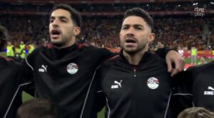 اثناء عزف النشيد المصري الجماهير الاسبانية اطلقت صافرات استهجان !! الصحفي الإسباني اورتيغا علق علي تلك اللقطة : ” بعض جماهير اسبانيا استهجنت نشيد مصر