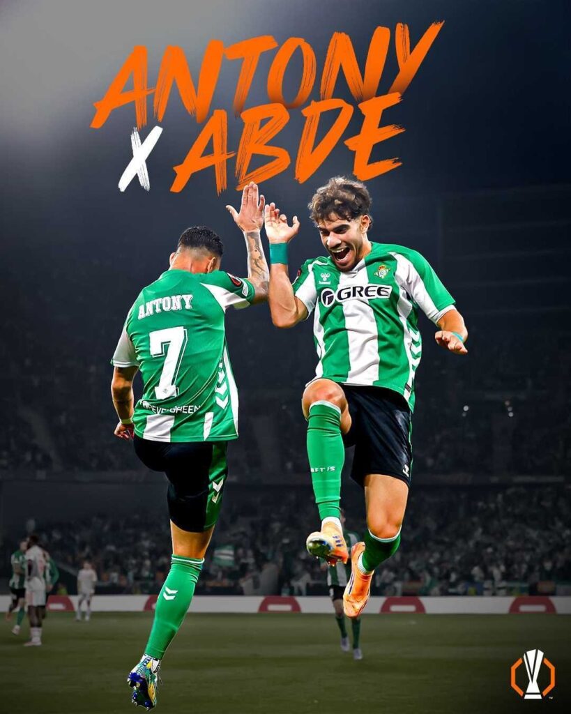 من إحتفال أسد الأطلسي المغربي ” عبد الصمد الزلزلولي ” 🇲🇦 لاعب نادي ريال بيتيس الأسباني رفقة البرازيلي أنتوني بهدفه في مرمى نادي سبورتينغ براغا البرتغالي بالدوري الأوروبي ..