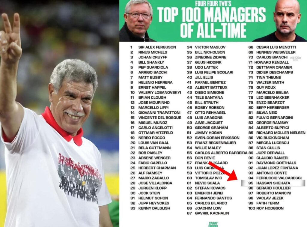 مجلة ” Four Four Twos ” العالمية تضع الاسطورة ” حسن شحاتة ” في المركز 95 بترتيب أفضل 100 مدرب في تاريخ كرة القدم