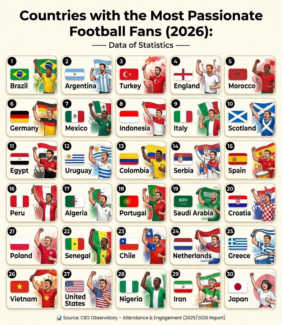 المغرب 🇲🇦 يتصدر ترتيب أكثر الشعوب شغفًا بكرة القدم في إفريقيا، ويحتل المركز الخامس عالميًا سنة 2026